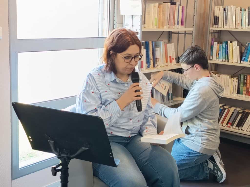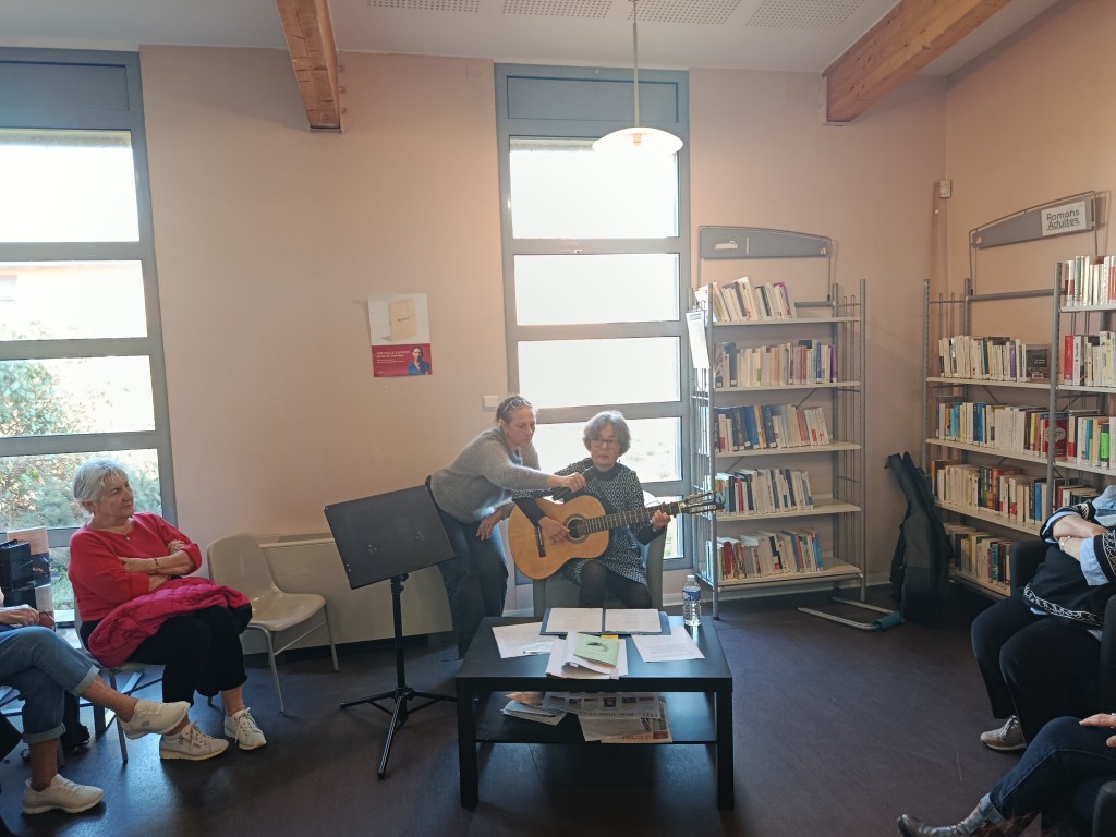 Régine s’accompagnant à la guitare, Stéphanie, responsable de la médiathèque, l’aidant avec le micro, après une lecture bouleversante de l’un de ses textes…
