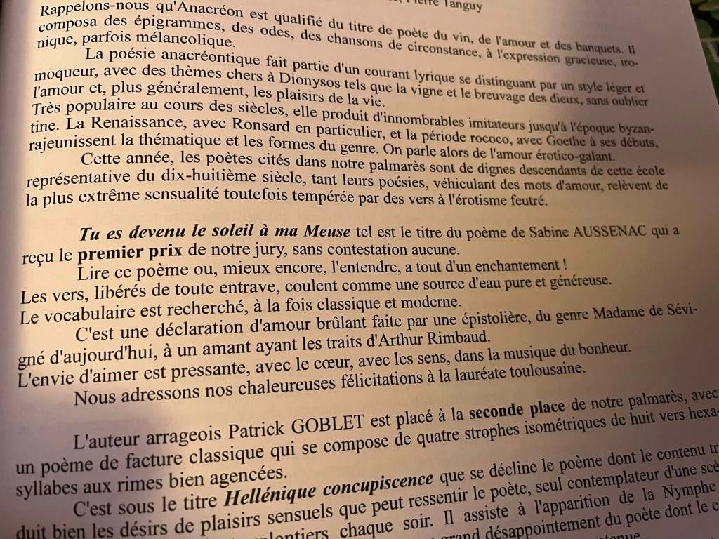 Un honneur ne venant, à l’instar du bonheur, jamais seul, j’ai eu la joie de recevoir dernièrement le premier prix de la section « anacréontique » des superbes Joutes poétiques de la société des Rosati d’Arras! Ces joutes sont la version « nordique » de nos Jeux Floraux toulousains, et je vous laisse imaginer ma joie d’y avoir été distinguée.