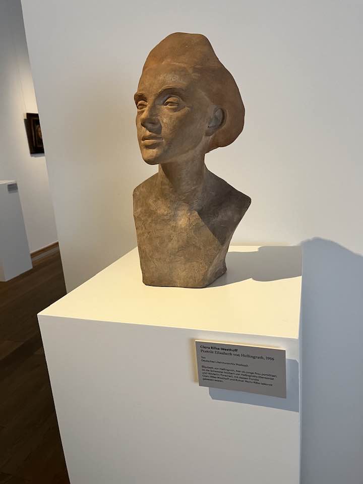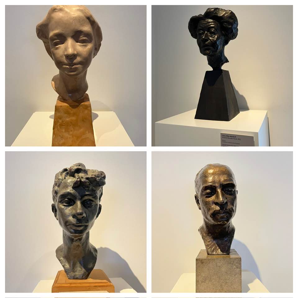 Différentes sculptures de Clara Rilke exposées à l’été 2025 au musée Vogeler, dont le buste de Rilke, en bas à droite. En haut à droite, le buste de l’écrivaine Ricarda Huch, © 2025 Sabine Aussenac
