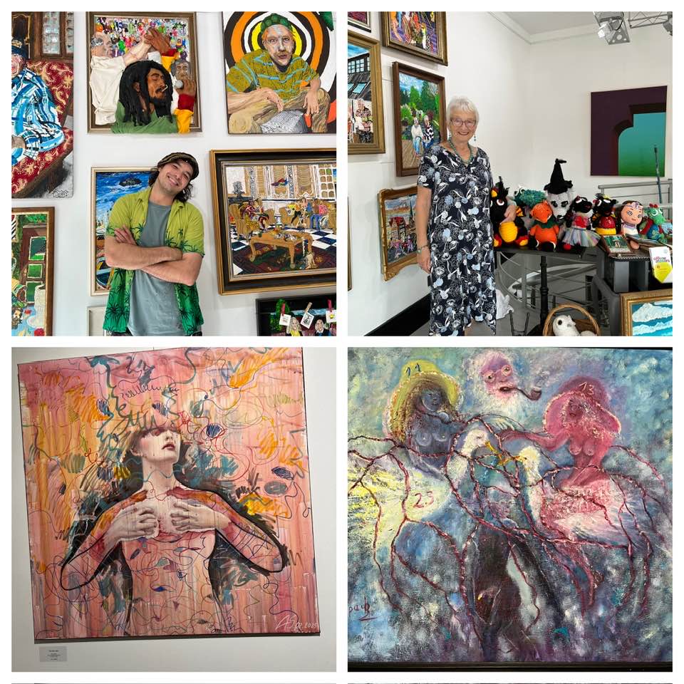 En haut à gauche le peintre Danny Janke; https://schluh.art/pages/d-nny, instagram D@nny. En haut à droite l’artiste tricoteuse Karin Beger, photographiée (©Sabine Aussenac) à la Gallery &ArtClub de Markus Lippeck, qui gère aussi la galerie Schluh https://schluh.art/