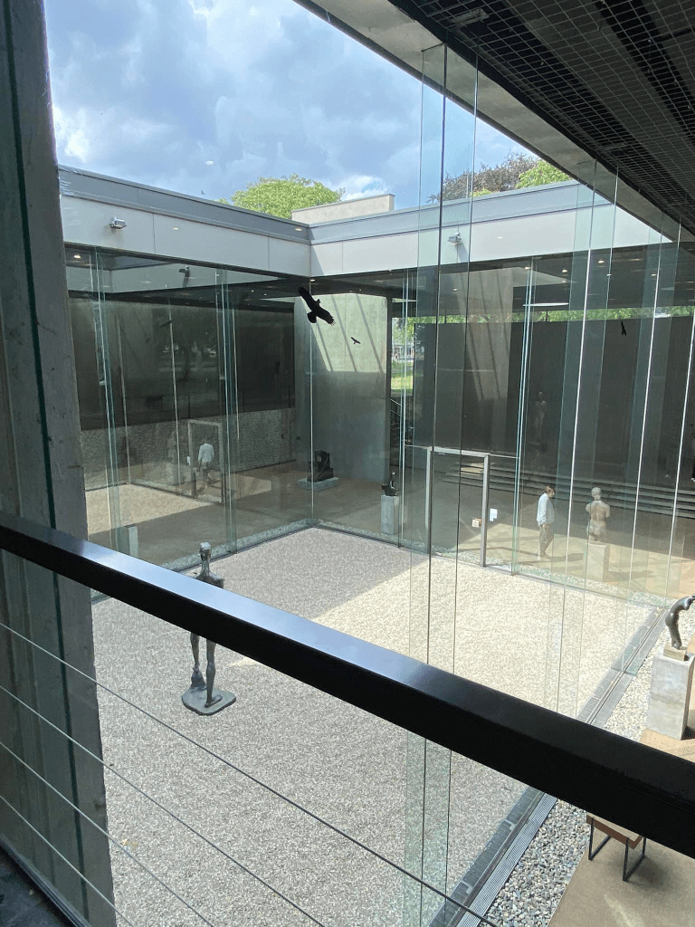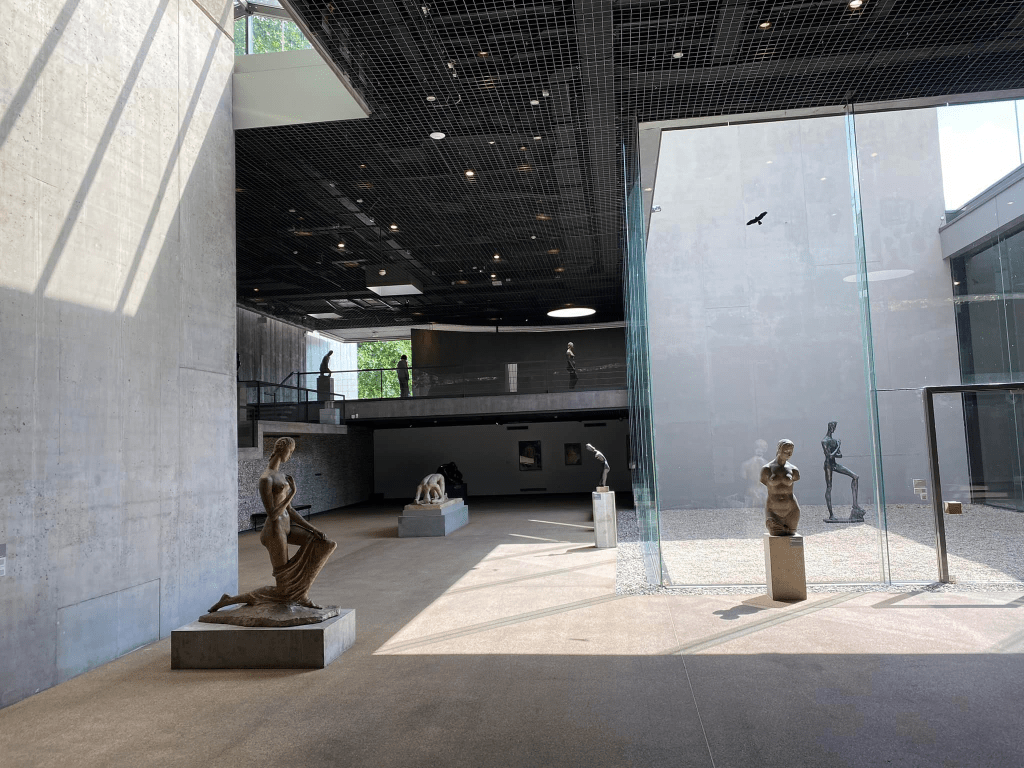 En pénétrant dans le sas d’entrée après avoir gravi quelques marches, après la découverte apéritive de sculptures disséminées dans le parc, les visiteurs sont d’emblée frappés par l’immédiateté, la proximité des œuvres. Le musée n’abrite pas moins de 300 peintures, 500 dessins et plus de 1000 sculptures, de très grands noms comme Magritte, Dali, Picasso, Käthe Kollwitz ou Giacometti côtoyant les sculptures de Wilhelm Lehmbruck.