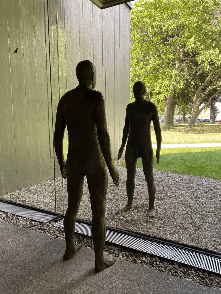 Le plus joyeux clin d’œil à cette immanence entre l’art et la vie qui permet la rencontre entre les peuples se concrétise lorsque les visiteurs du musée pensent avoir la berlue en voyant Reflexion II (Reflection II) d’Anthony Gormley, cette sculpture duelle se faisant face de part et d’autre d’une paroi vitrée, la gémellité de la fonte renvoyant à l’altérité qui nous effraie ou nous rassemble.