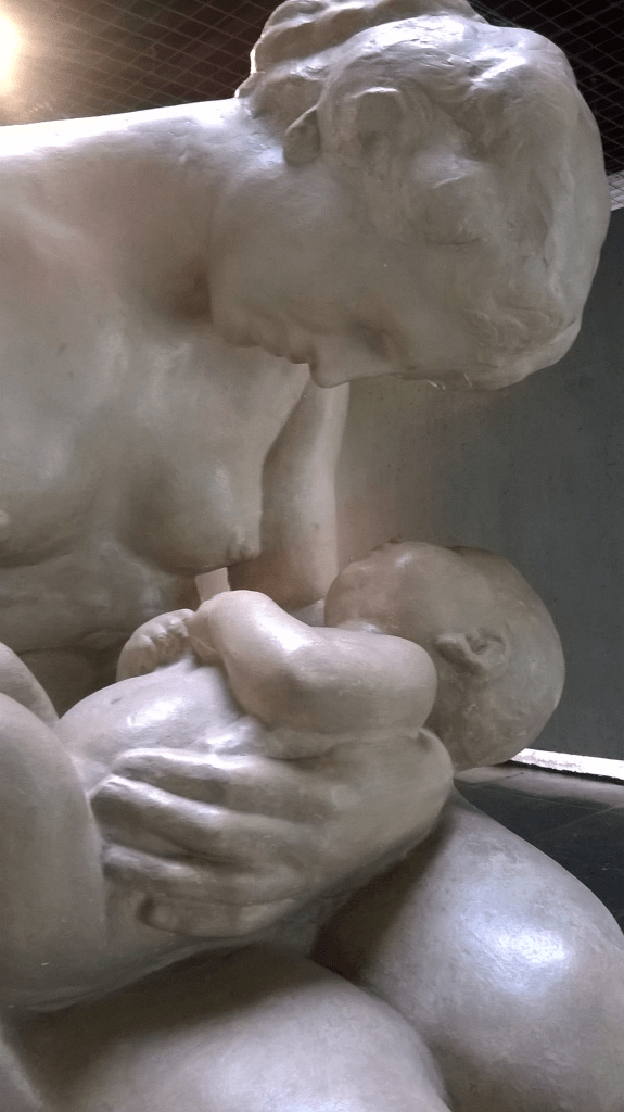 Souvent pourtant il brouillera les pistes et façonnera des visages empreints de la quintessence de l’humanité auxquels chaque visiteuse et chaque visiteur du musée peuvent s’identifier, d’âme à âme, sur le modèle de sa Grande penseuse (Große Sinnende) qui toise les visiteurs de ses grands yeux à peine ébauchés, les incitant à la réflexion du haut de son corps hiératique et pré nubile. Cette statue-là m’évoque invariablement la jeune sœur de ma mère et la meilleure amie de cette dernière, toutes deux devenues sculptrices et ayant aussi modelé des corps de femmes, sans nul doute inspirées par la fréquentation du musée du temps de leur adolescence, et elles-mêmes si inspirantes puisque je leur dois mon amour de l’art…