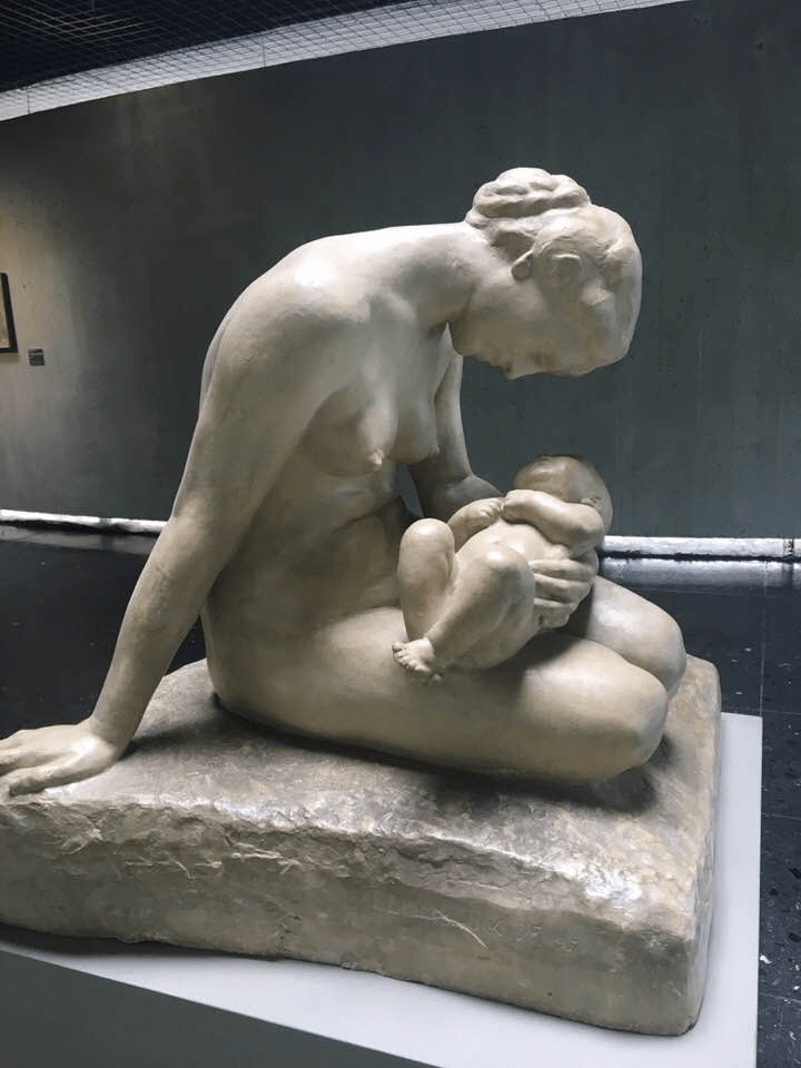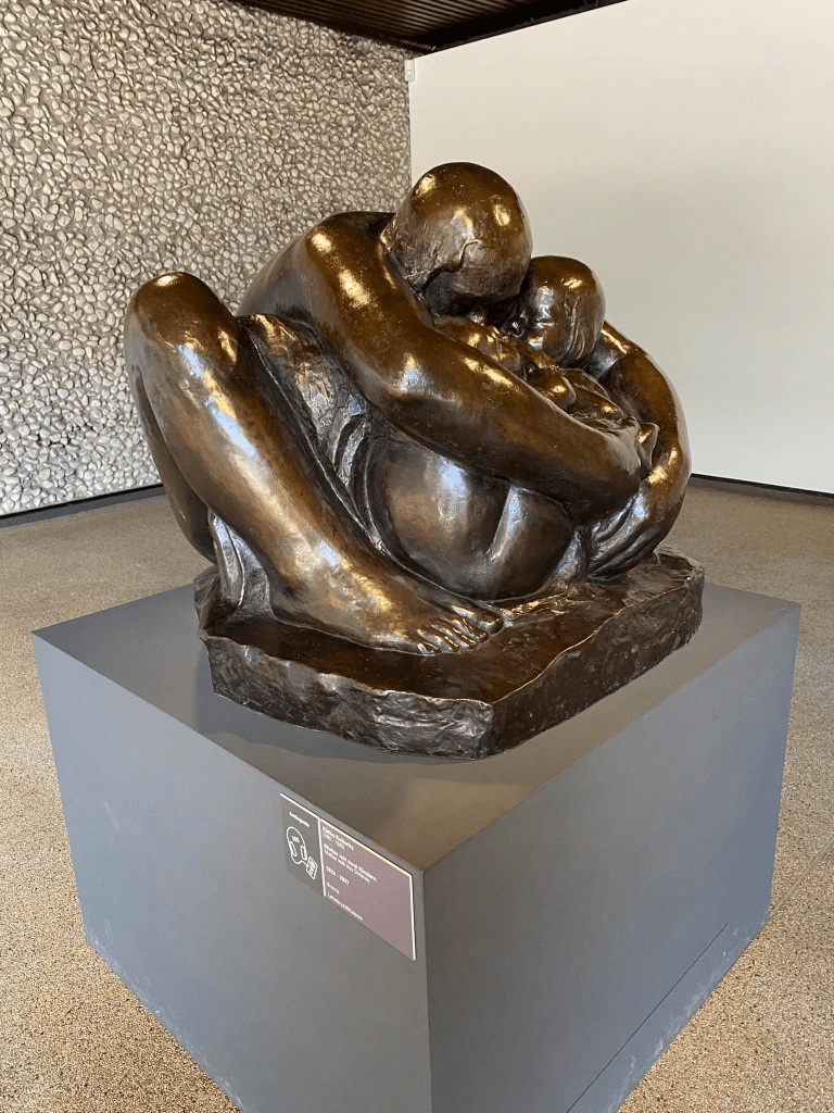 Cette statue trouve un immense écho dans la bouleversante sculpture de Käthe Kollwitz que l’on peut aussi admirer au musée Lehmbruck : sa Mère aux deux enfants (Mutter mit zwei Kindern), qui les tient serrés contre elle, mère-louve face au monde, fait pendant à la maternité vue par Lehmbruck.