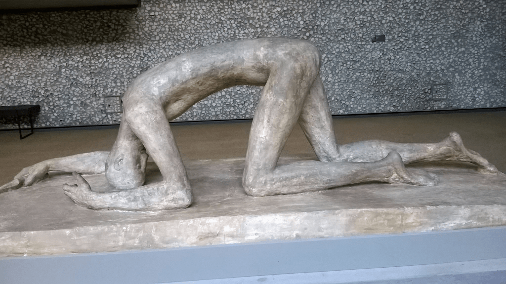 Les femmes, les femmes sculptées, ce sont elles qui me bouleversent le plus lorsque je flâne et me perds entre les niveaux du musée. La statue de celle qui se nomme justement La Duisbourgeoise (Die Duisburgerin), qui a été la seule sculpture vendue du vivant de l’artiste, offre un corps voluptueux aux regards mais porte sur son visage les stigmates de toutes ces mères-courage ayant traversé l’histoire de la ville, emblème de ces femmes ayant parfois perdu tous leurs fils lors de la première guerre mondiale, comme la grand-mère paternelle de mon grand-père allemand dont les quatre fils étaient tombés dans la Somme, de ces Trümmerfrauen (littéralement femmes des décombres) qui, fichu sur la tête, ont déblayé pierre après pierre les ruines fumantes de la ville éventrée par les bombardements alliés, ceux qui faisaient hurler de terreur ma propre mère qui n’était qu’une enfant innocente… Wilhelm Lehmbruck a façonné à sa Duisbourgeoise un visage aux traits un peu moins anonymisés que ceux des autres sculptures, permettant aux visiteurs d’y reconnaître des émotions précises.