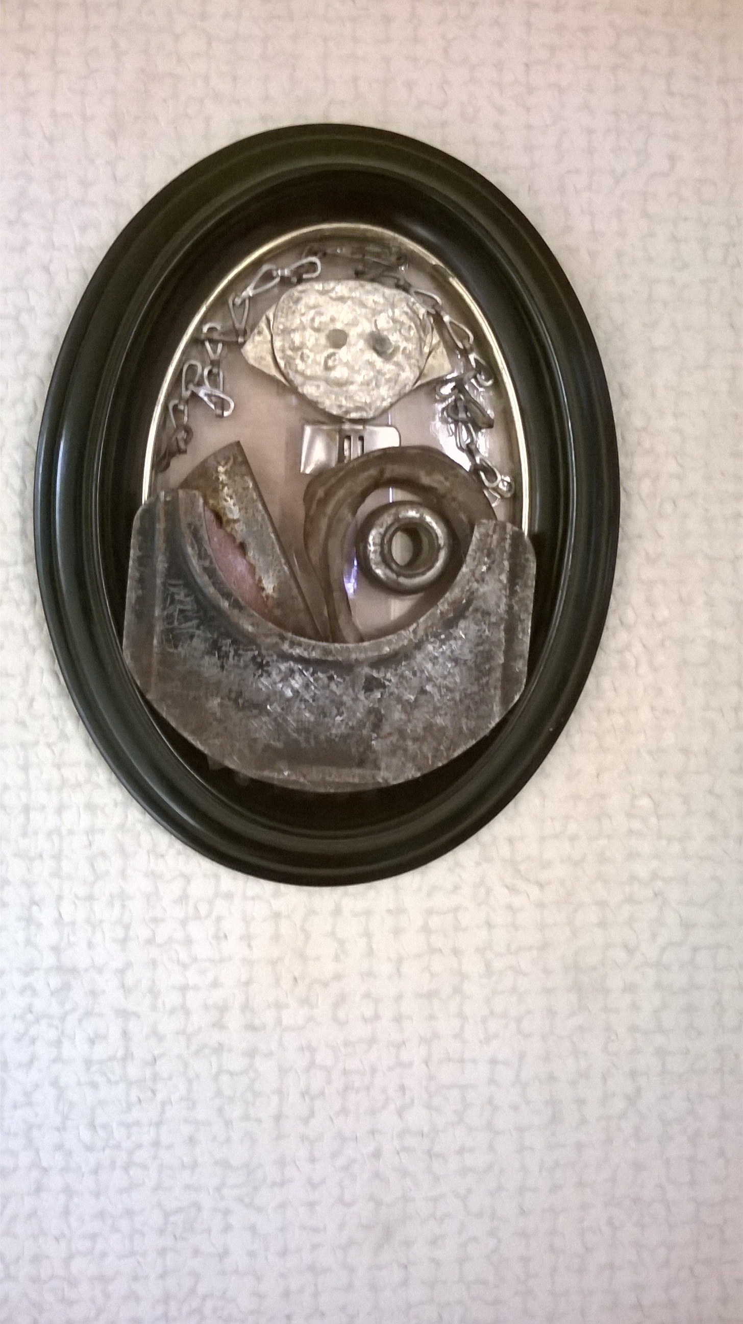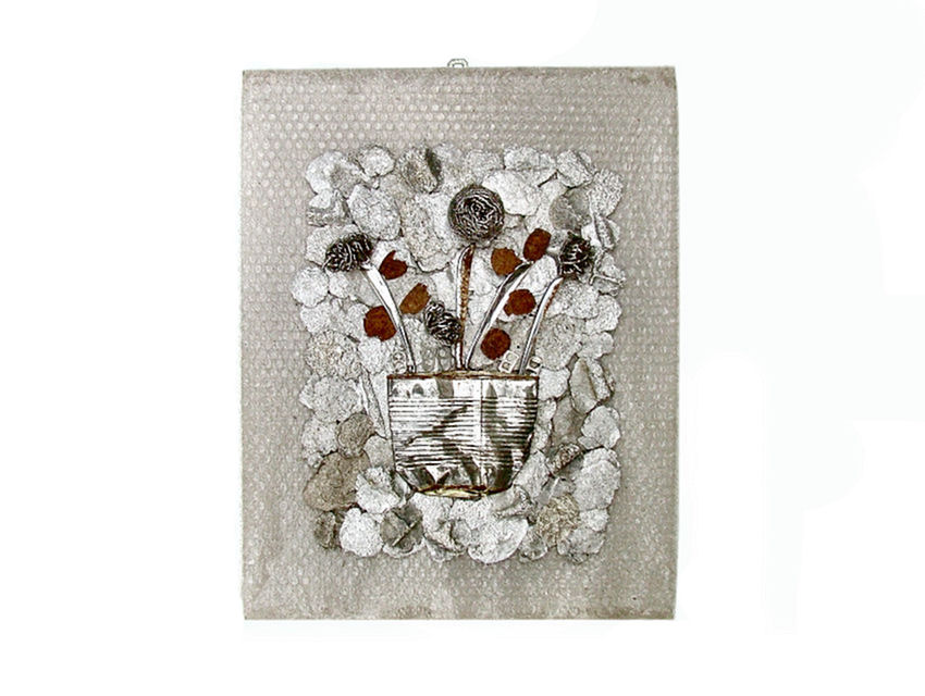 « It started off when I saw the beauty of the colour and structure of those rusty, crushed drink cans that you find littering the streets. So I picked up a few to do something with them one day, as a change from my usual work as a sculptress. Besides cans I now pick up many other sorts of ‘old iron’. Almost anything can turn out useful. Especially bicycles lose lots of interesting parts in the street. The metal trays I use as a background or basis for my collages are bought in jumble sales and flea markets. I prefer making figures and heads and in this I feel akin to Giuseppe Archimboldo, a 16th century Italian painter whose heads are composed of fruit, vegetables, flowers and fish. »