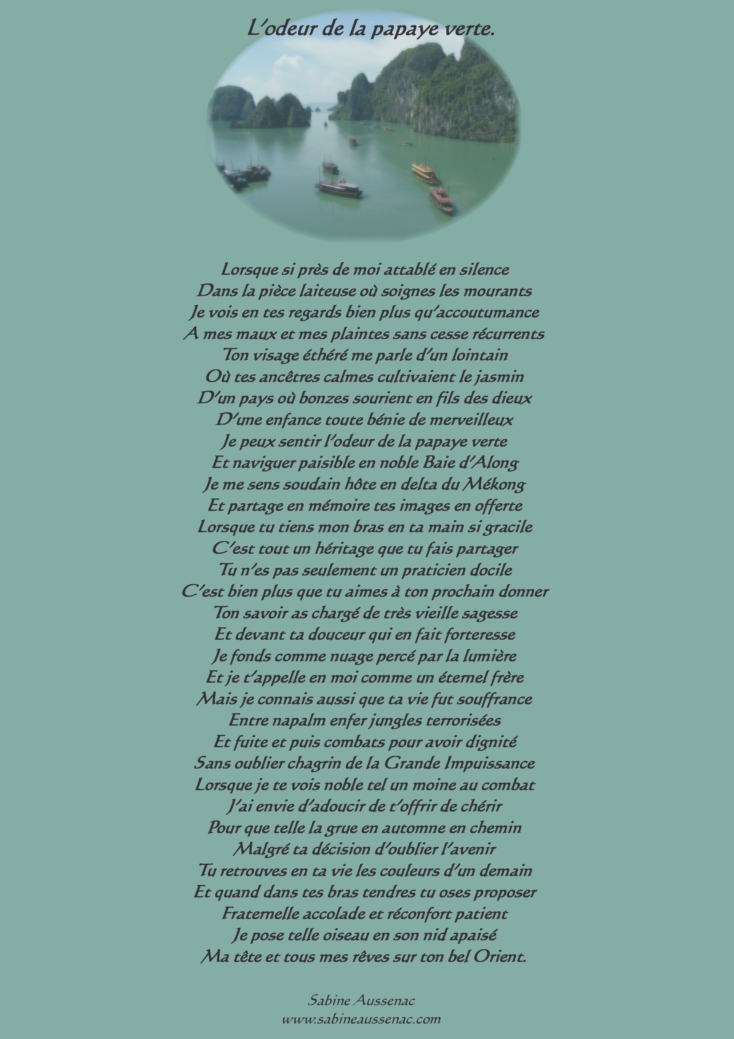 Et au travers de notre terre si fabuleuse ces millions de parfums, de fragrances, de senteurs, d’odeurs se croiseront en mille méridiens fraternels, depuis les bortchs capiteux aux délicates fleurs de sakura, en passant par les orangeraies californiennes et par les effluves de tiaré…